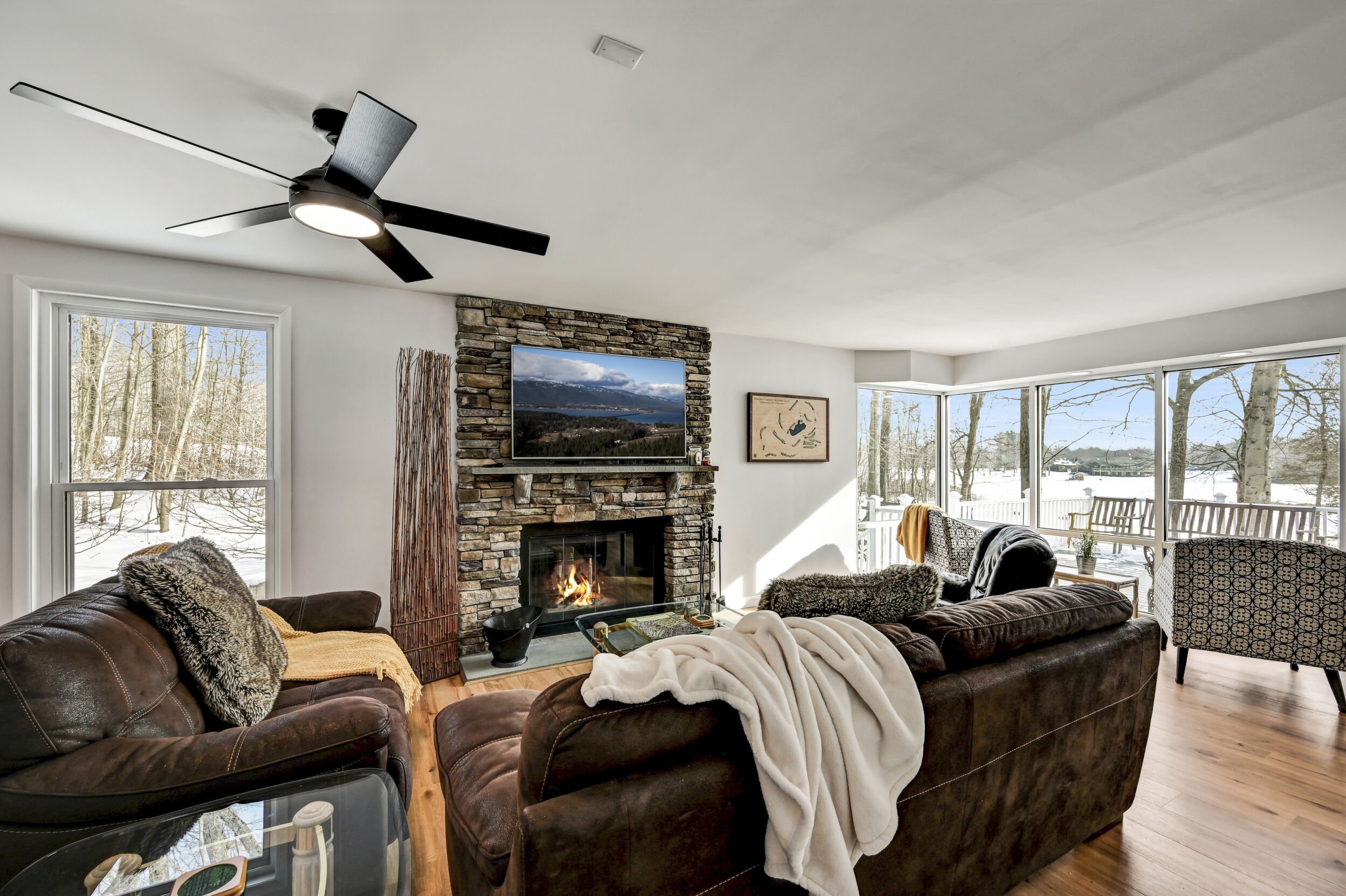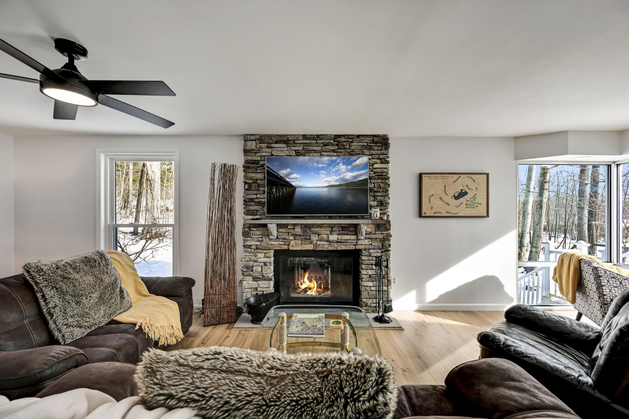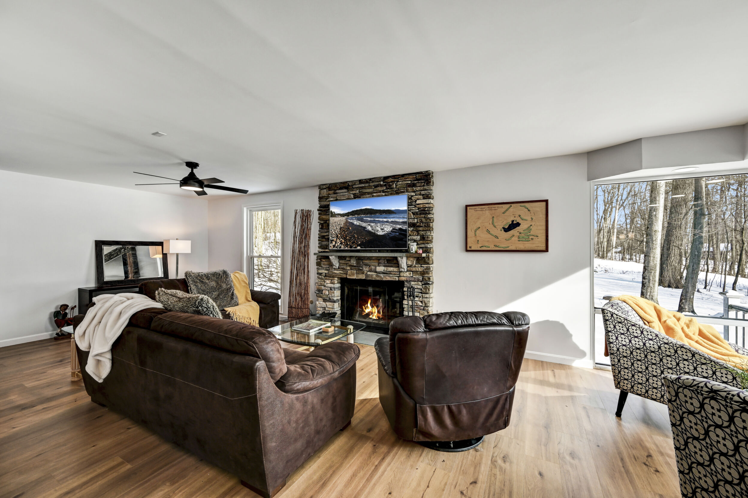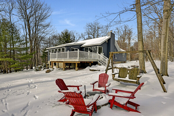 Rare Golf & Lakefront Pocono Home w/ Private Access To One Of The Most Desirable Holes On The Course, A Short Par Overlooking Both The Beach And Lake, Providing Stunning Views & A Truly Unique Setting! This Tastefully Renovated Gem Sits On Nearly 1/2 Acre In A Peaceful Cul-De-Sac w/ Circular Driveway, 2 Car Garage & Ample Parking. Step Outside To Enjoy The New Decking, Private Backyard & Fire Pit. New Roof, New Siding, New Windows & New Fixtures Set The Stage For Success. The Modern Kitchen Showcases Tasteful Updates, Quartz Countertops & Island, Flowing Seamlessly Into The Sunlit Sunken Four Season Room With Stunning Lake Views, Hardwood Flooring & Bar Top Seating. Relax In The Family Room Featuring Hardwood Floors, Wood Burning Fireplace With Floor-To-Ceiling Stone Wall & Mantel, Or Unwind In The Scenic Sitting Nook With Panoramic Lake And Golf Views. Formal Dining Room Offers Hardwood Floors And A Striking Beamed & Vaulted Ceiling. The Freshly Painted Master Bedroom Suite Opens To A Private Deck, While The Elegantly Upgraded Master Bath Includes A Cozy Sauna And Walk-In Tiled Shower. Additional Highlights Include 3rd Bedroom w/ Attic Access, Spacious Renovated Main Tiled Bath w/ Double Vanity & Laundry Closet, Spacious Bedroom 2 With Lakefront View, Walk-In Closet & Jack & Jill Bath. Tiled Lower Level Recreation Room Has Garage Access, Several Tiled Bonus Rooms & Lower Level Full Bath. This Resort-Style Community Features An Art Wall Jr. Designed Championship Golf Course, Practice Facility, Pro Shop, Casual Dining, Catering & Banquet Spaces, Olympic Size Pool, Tennis Courts, Fitness Center, Sandy Beach, Stocked Lake & Family Entertainment Events. The Lifestyle You Deserve!