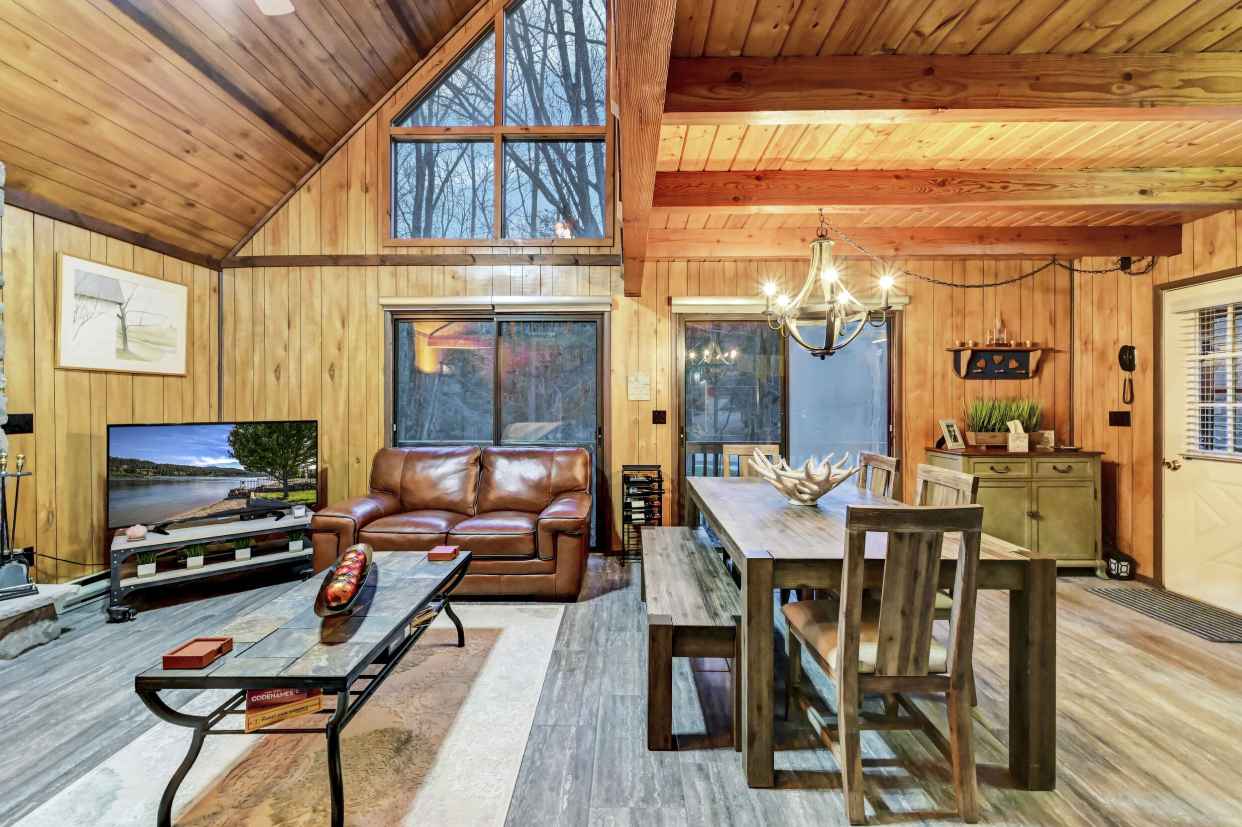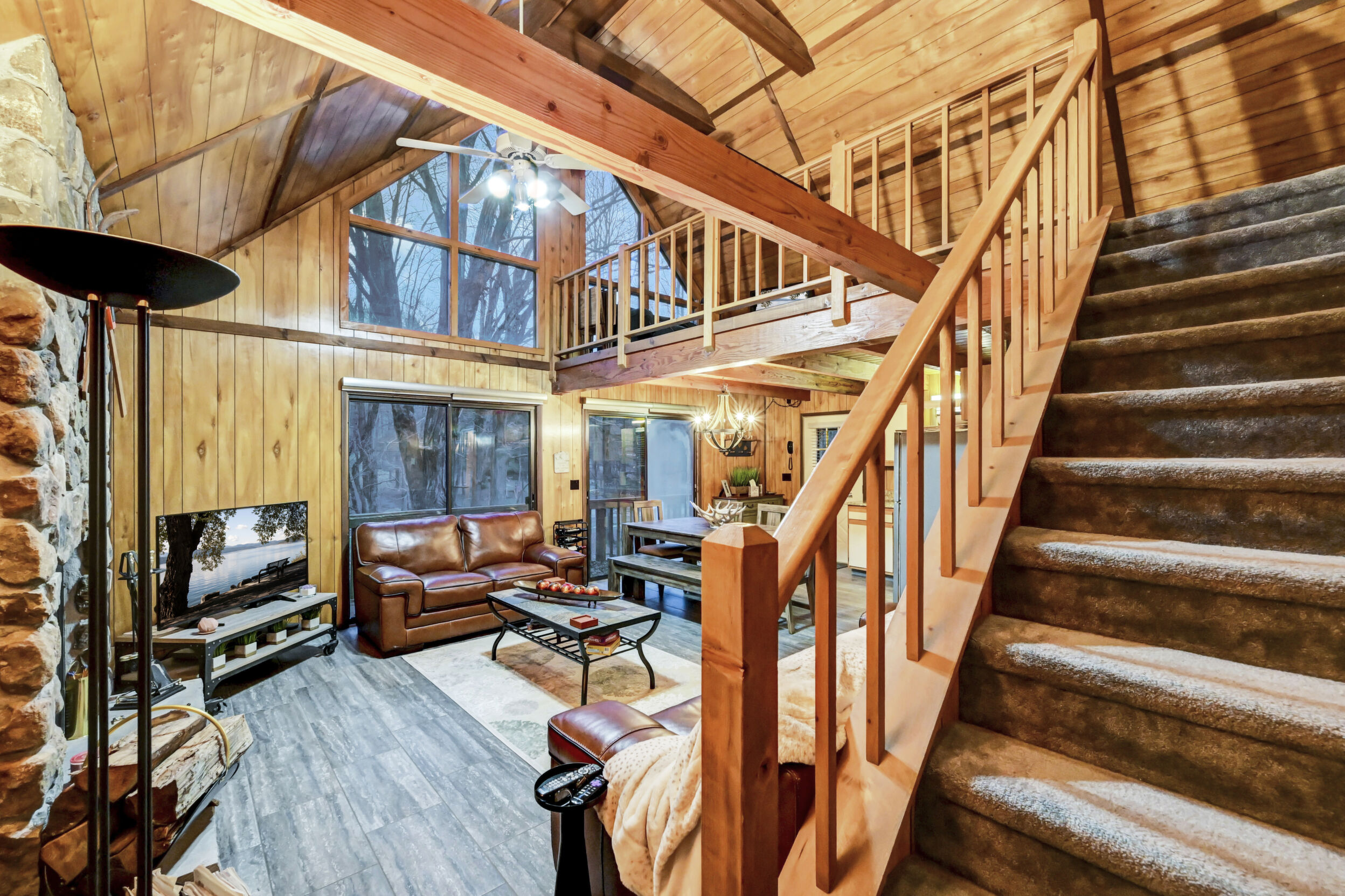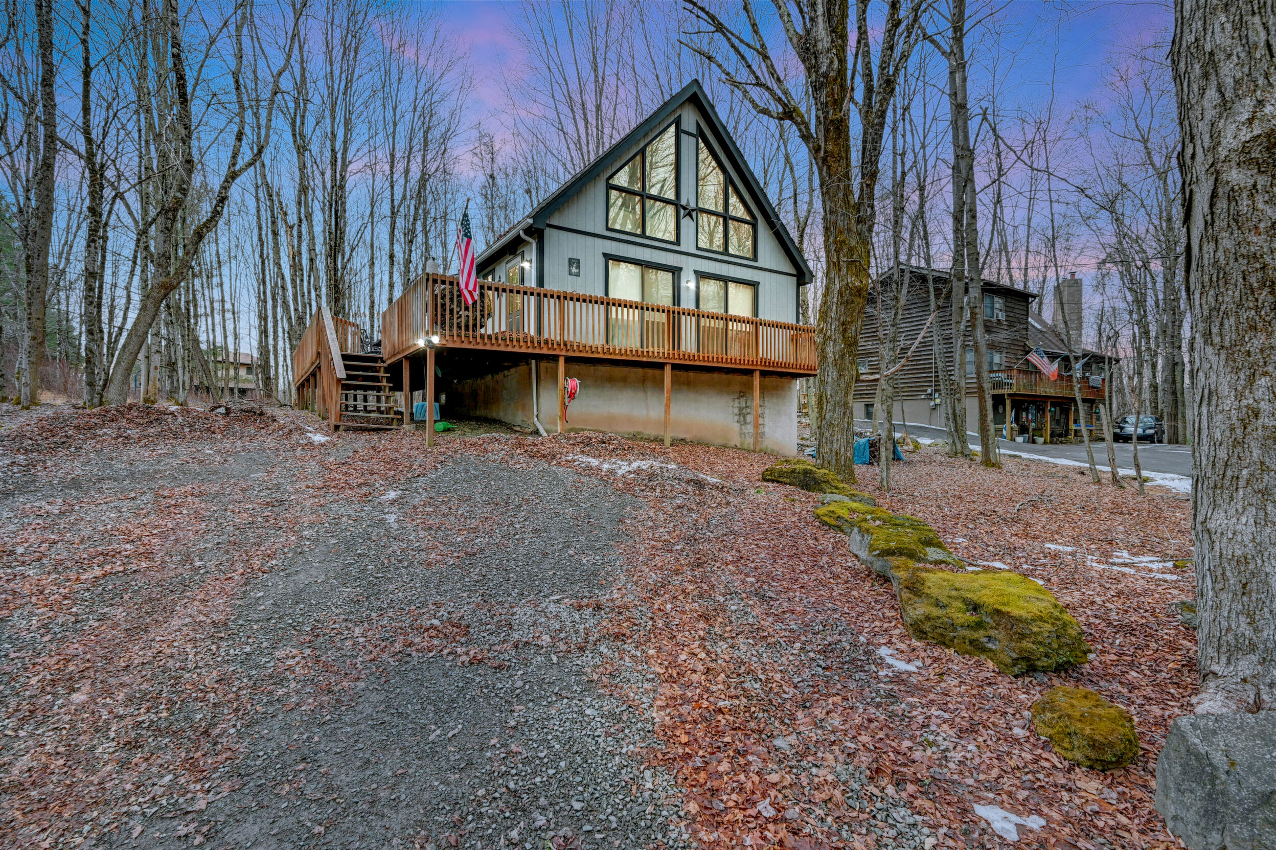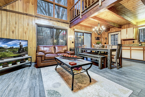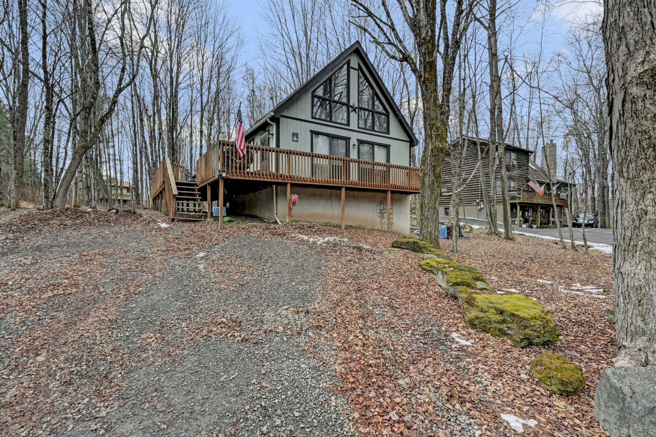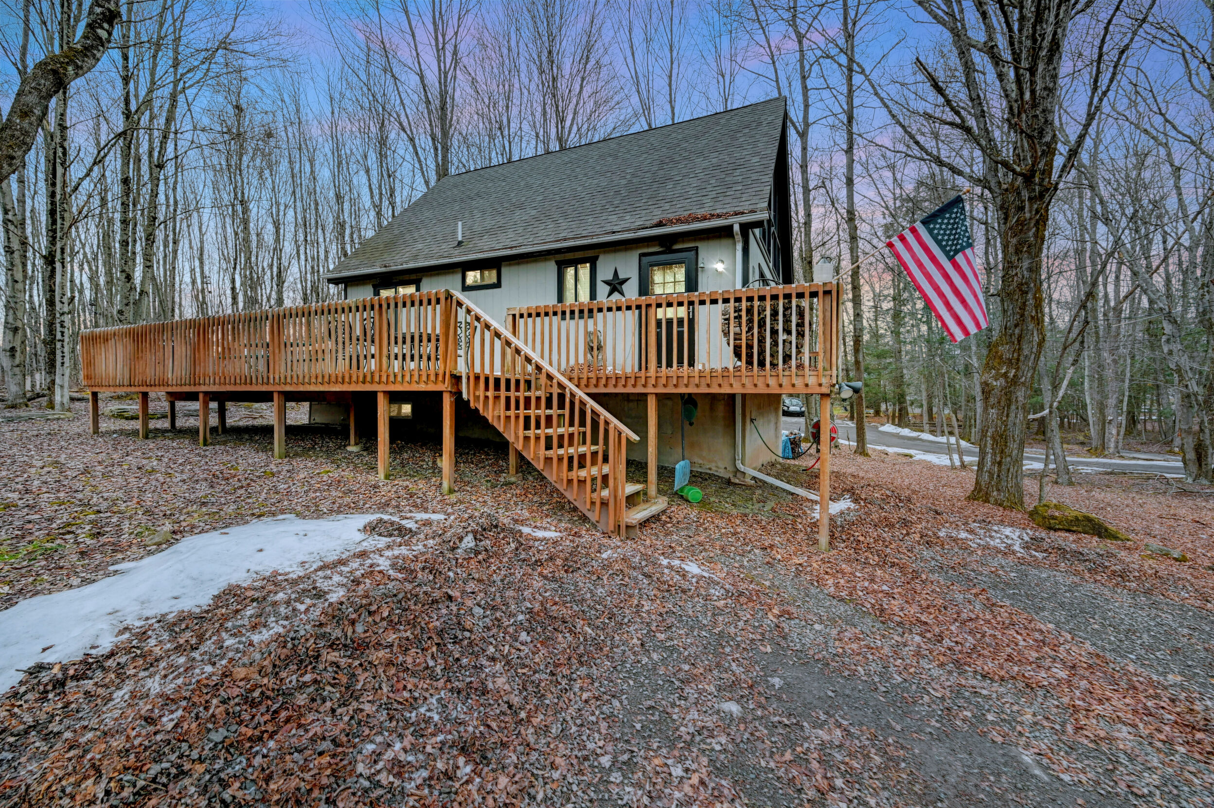 When you think of the perfect mountain chalet--this is it!Located in The Hideout, a four-season, amenity-filled community in the Northern Poconos, just two hours from the NYC, NJ, and Philadelphia metro areas, this chalet offers the ideal blend of location, charm, and lifestyle. Situated in the highly sought-after ''Golden Triangle,'' the home is a short distance to Deerfield Lake, a peaceful 24-acre non-powerboating lake, and conveniently close to other top amenities including the ski hill, art center, and Roamingwood Lake, where you'll find the beach, pickleball courts, main lodge, and tiki bar.Set on a wooded lot, the home features a large deck perfect for enjoying the natural surroundings. Inside, a spacious 3/4 loft provides excellent additional sleeping space and overlooks the living room below, enhancing the classic chalet feel. The living room showcases a beautiful stone fireplace, high ceilings, and an open layout that highlights the loft above. Tile flooring runs throughout the main level, which also includes a beautifully updated full bathroom.The finished walk-out lower level offers even more living space with tile flooring throughout and a flexible, open layout that includes a den area, large recreation space, an additional den/game room, and a second full bathroom.This is mountain living at its best--perfect as a getaway, investment, or full-time retreat in one of the Poconos' most desirable communities.